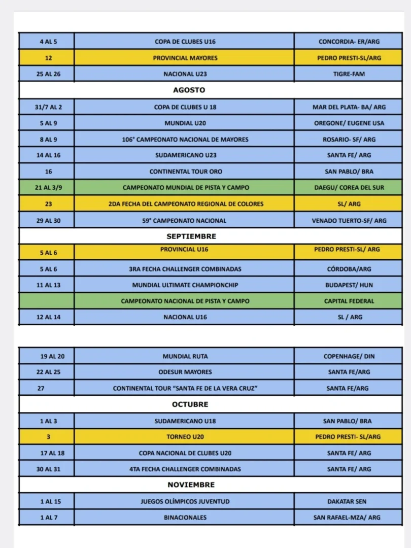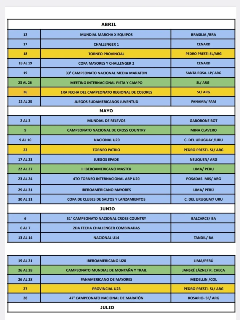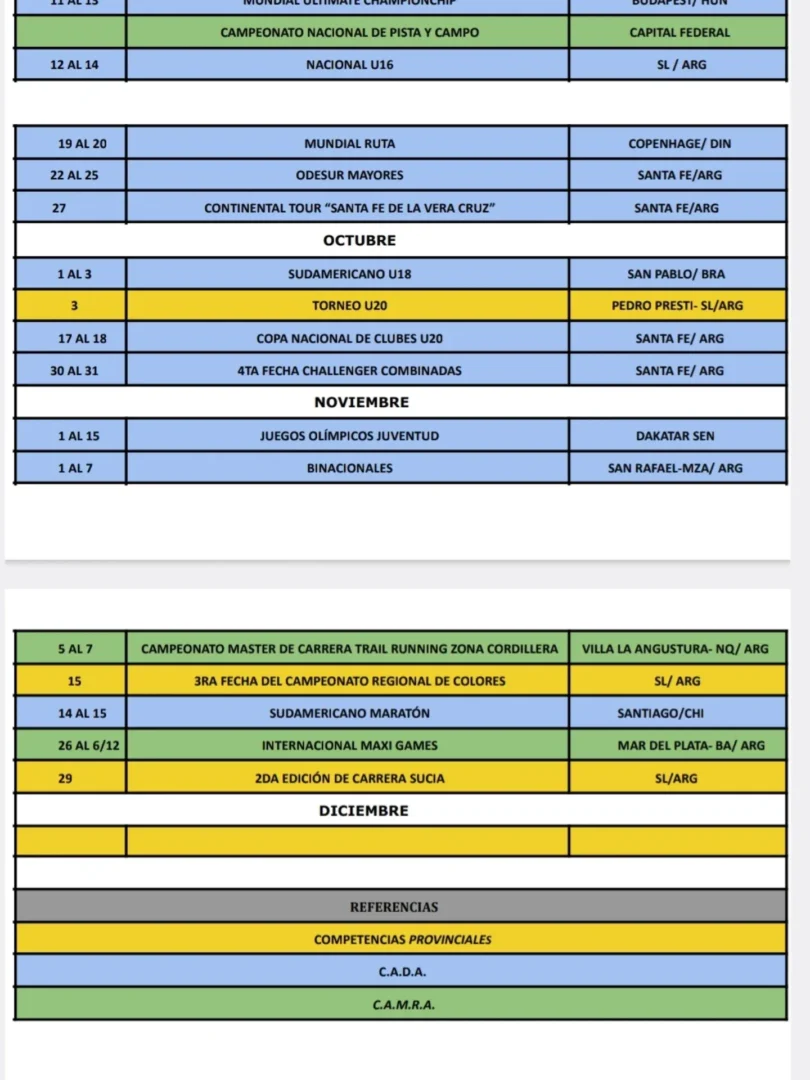 En los recortes del cronograma compartidos por FAS se observan, entre otras, referencias tempranas de la temporada con sede en San Luis y también en otras provincias y países. A modo informativo y según el calendario difundido, figuran en enero el “Campamento Combinadas” (7 y 8, Pinamar/ARG), el “Mundial Cross Country” (10, Tallahassee/USA) y la carrera “Calle Angosta” (18, Villa Mercedes-SL/ARG).